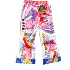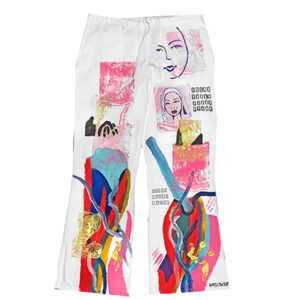 Each customized, one of a kind, using thrifted or bought white scrub pants that I handpaint and draw directly onto the fabric on both front and back sides.